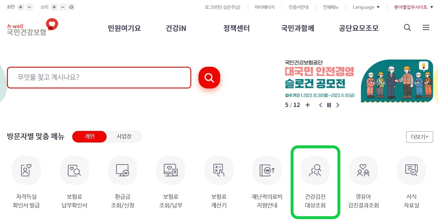 ● 국민건강보험공단 홈페이지 접속 - 초록 네모박스 위치에 있는 [ 건강검진 대상조회 클릭 ]