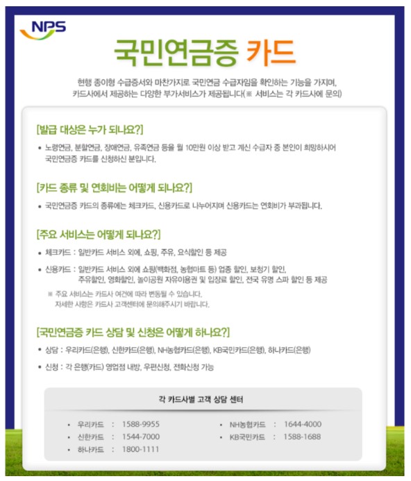 그래서 국민연금증 카드는 국민연금 수급자를 증명하는 신분증으로 신용카드나 체크카드의 결제 기능까지 갖춘 카드형태의 신분증이라고 보시면 되겠습니다.
