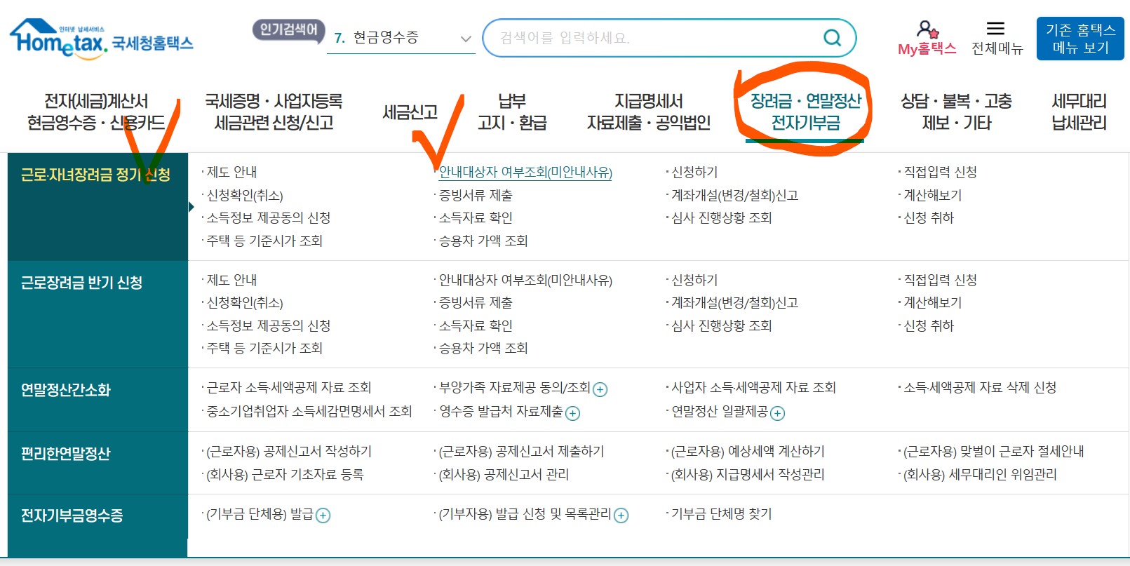 - 근로.자녀장려금(정기) 메뉴에서 하단의 [안내대상자 여부조회]를 선택하여 조회합니다.