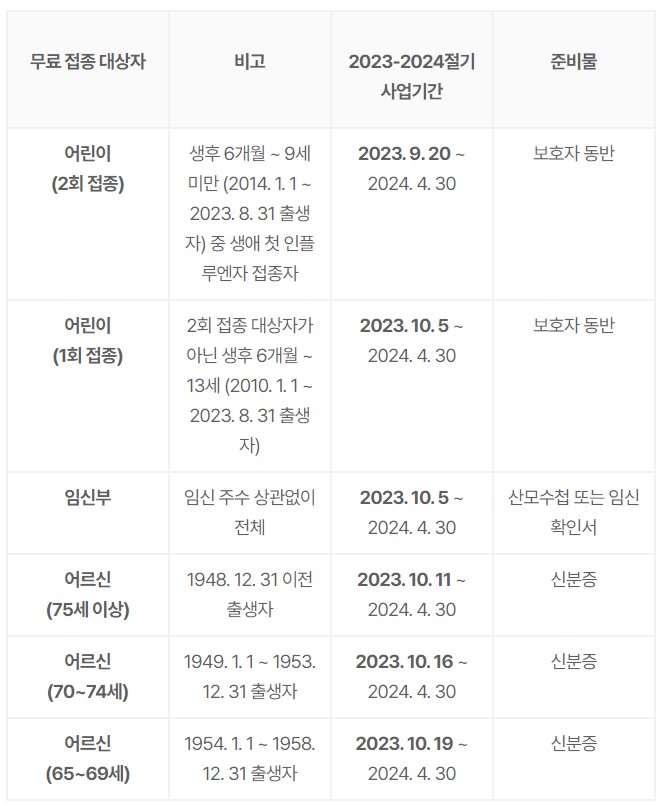 생후 6개월 ~ 13세 어린이와 임신부, 65세 이상 어르신은 독감 무료접종 대상자입니다.