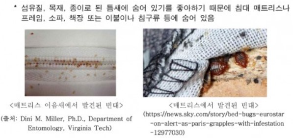 - 빈대는 주로 야간에 잠을 자는 사람을 흡혈하기 때문에 침대 등 잠을 자는 위치와 가까운 곳에 주로 서식