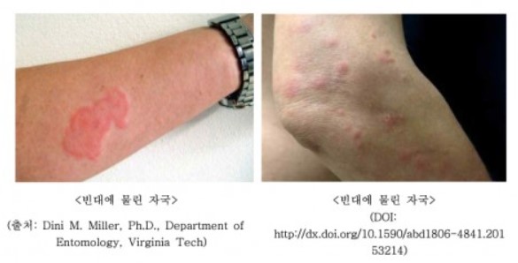 빈대에 물린 자국은 모기에 물린 것과 비슷하지만 주로 가려지지 않은 팔이나 손, 목, 다리 등 노출된 부위를 물고, 혈관을 잘 찾지 못해서 두세곳을 연달아 물기 때문에 일렬이나 원형으로 자국이 생깁니다.