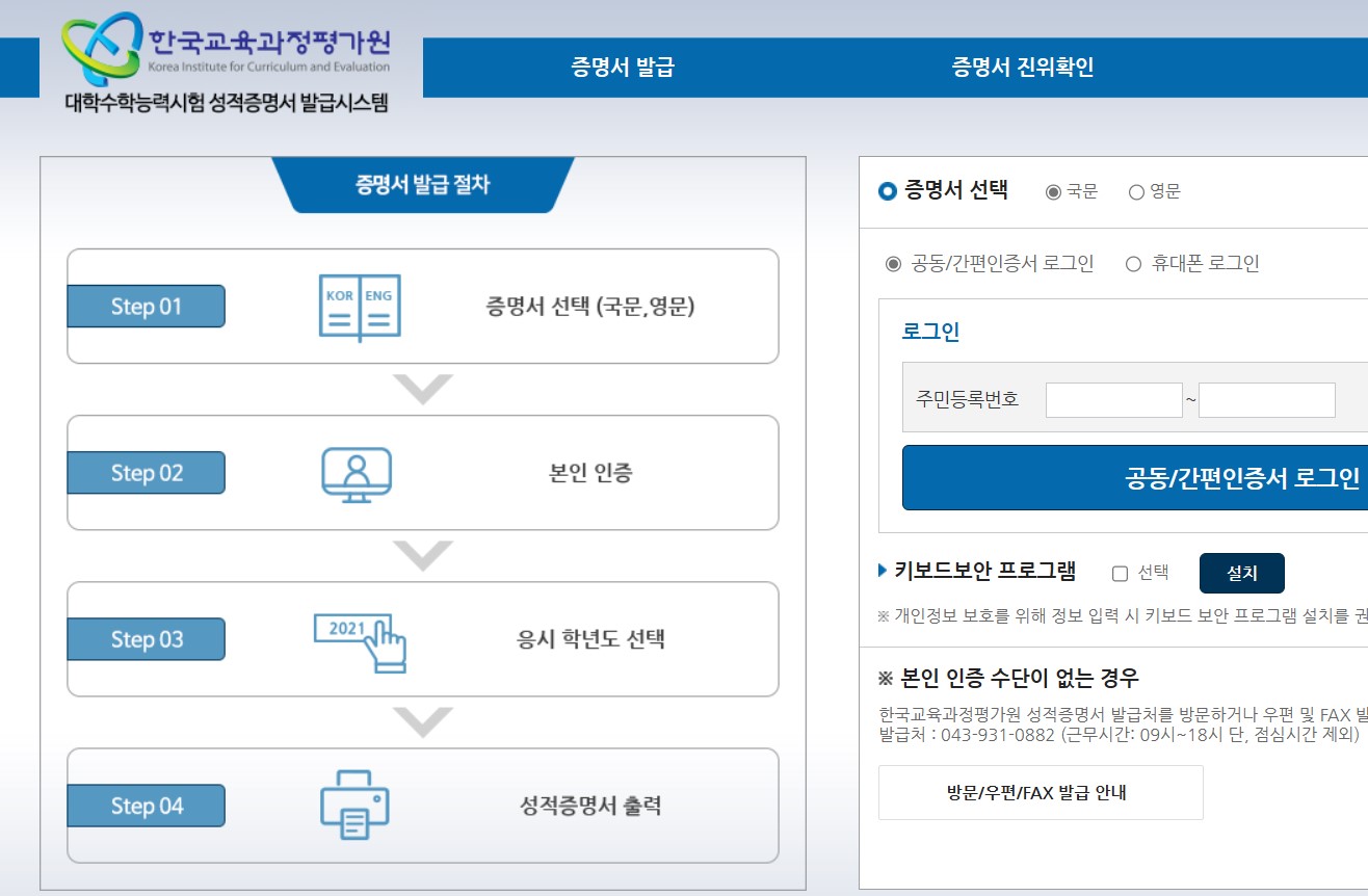한국교육과정평가원 홈페이지에 접속하여 수험생 본인의 공동인증서 등을 통해 발급이 가능합니다.