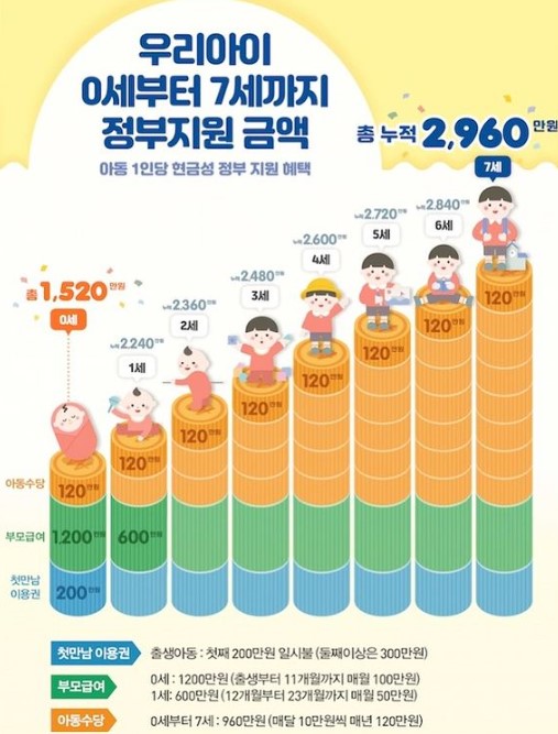 매달 10만원씩 0세부터 7세까지 연간 960만원이 주어지며, 아이가 8세가 될 때까지 지속됩니다.