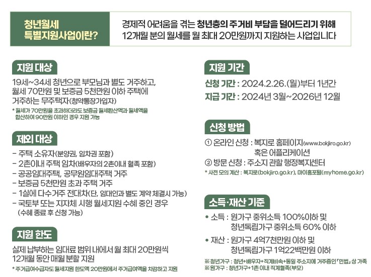 - 보증금 5000만원 이하, 월세 70만원 이하인 주택에 부모와 별도로 거주하는 무주택 청년(19~34세)을 대상으로 합니다.