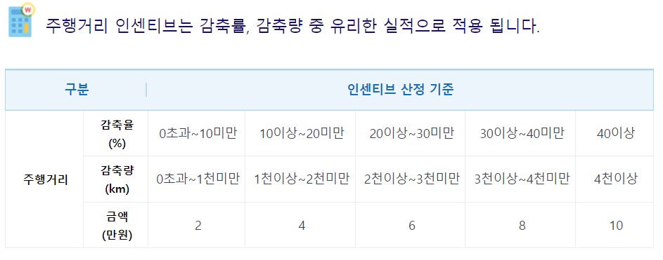 - 인센티브 지급: 주행거리 감축 실적에 따라 0~10만원 지급(12월) 인센티브 지급