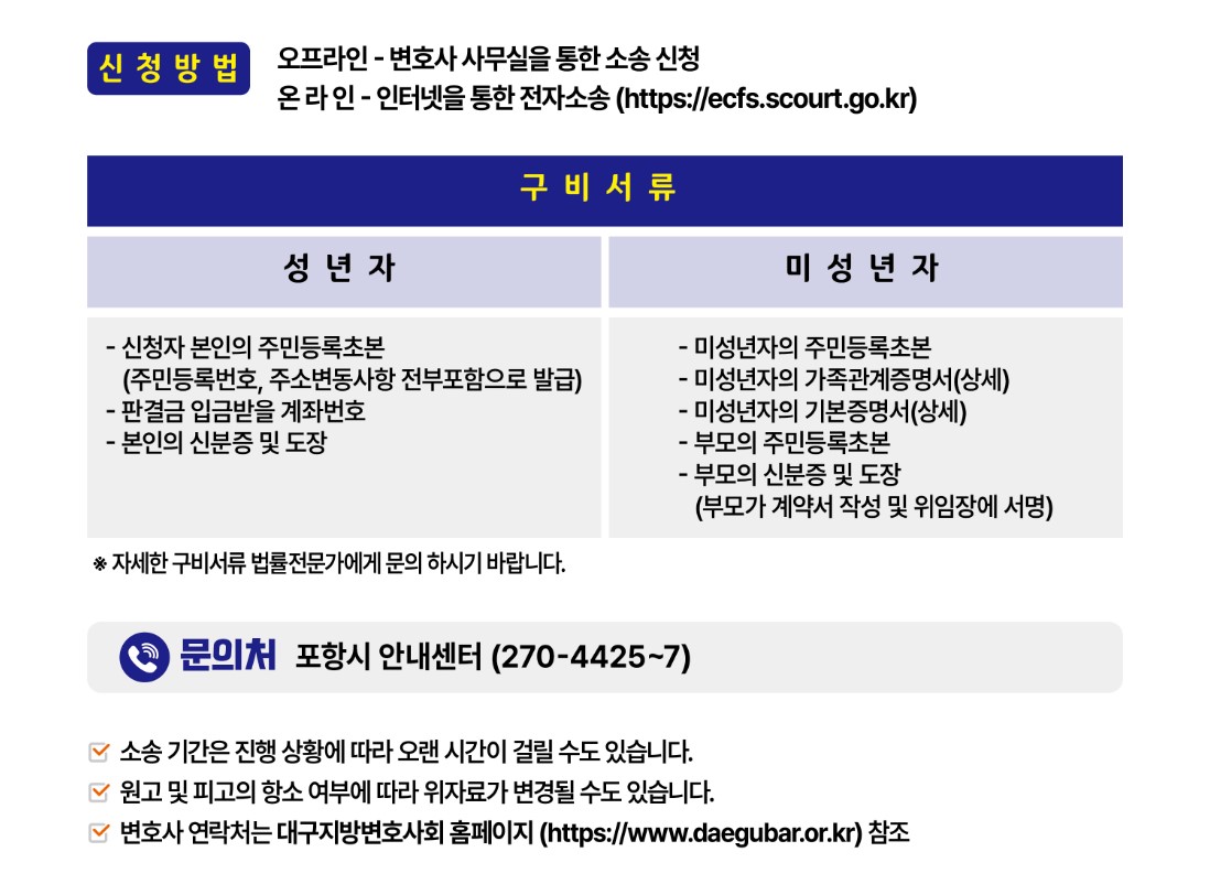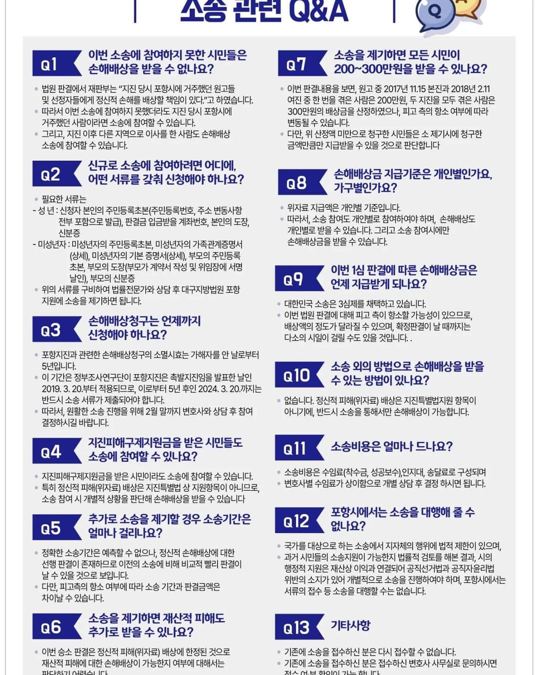 손해배상 소송시효가 2024년 3월 20일까지이다 보니 각 변호사 사무실도 안내자료를 배포하느라 분주한 가운데 포항시에서 발표한 공식적인 안내문이 있어 첨부해 드리겠습니다.