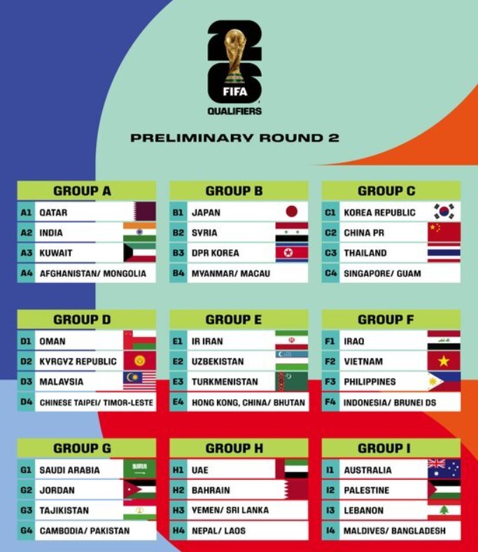 이번 아시아 2차 예선에는 총 36개국이 진출하는데 4개국씩 9개의 조로 구성 되었고 우승과 준우승이 최종 예선에 진출하게 됩니다. 각 조별 팀들은 홈 또는 어웨이로 6경기를 진행합니다.